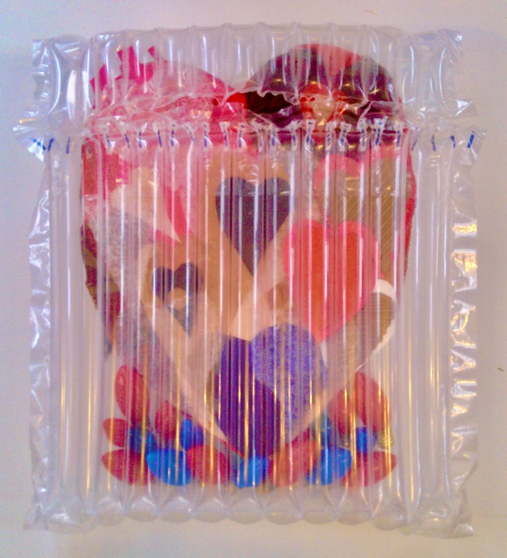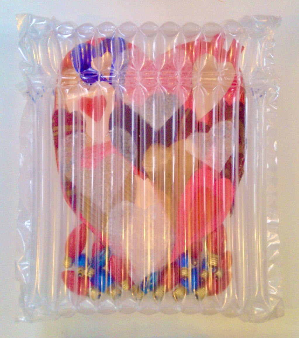 O.E. Fitzgerald, Handle with Care: Values in Our Hearts, 2023, waste bulbs, cardboard, fabric, plastic, 2’ x 15” (front)