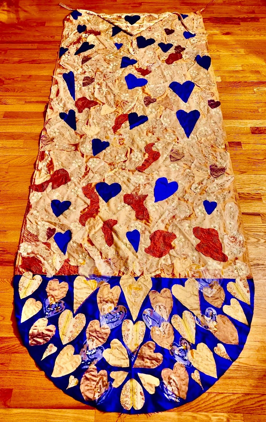O.E. Fitzgerald, Cloak of Tattered Hearts, 2023, worn fabric scraps, plastic, 10’ x 3.5’