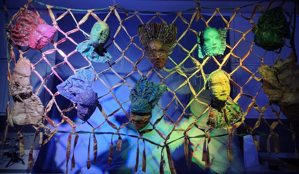 O.E. Fitzgerald, Lines of Flight, 2022, moulded papyrus parchment, tempera paint, mod podge, embroidery thread, recycled fabric remnants 9’ x 5’ (theatrical lighting)