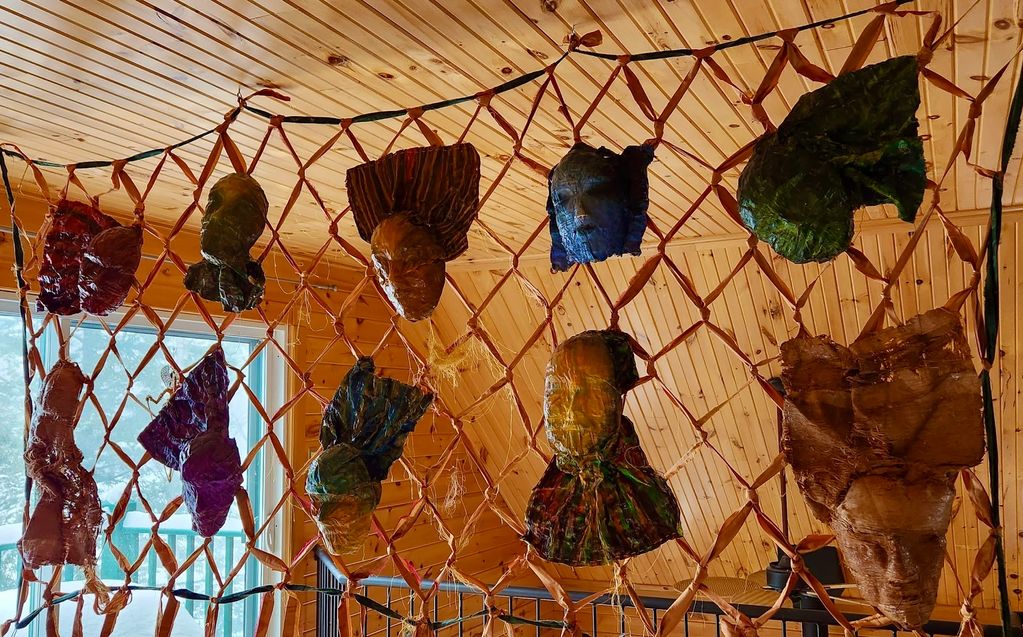 O.E. Fitzgerald, Lines of Flight, 2022, moulded papyrus parchment, tempera paint, mod podge, embroidery thread, recycled fabric remnants 9’ x 5’ (daylight)
